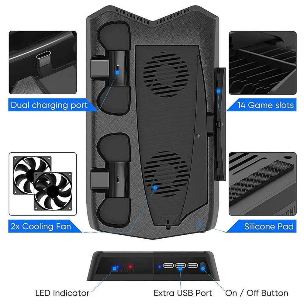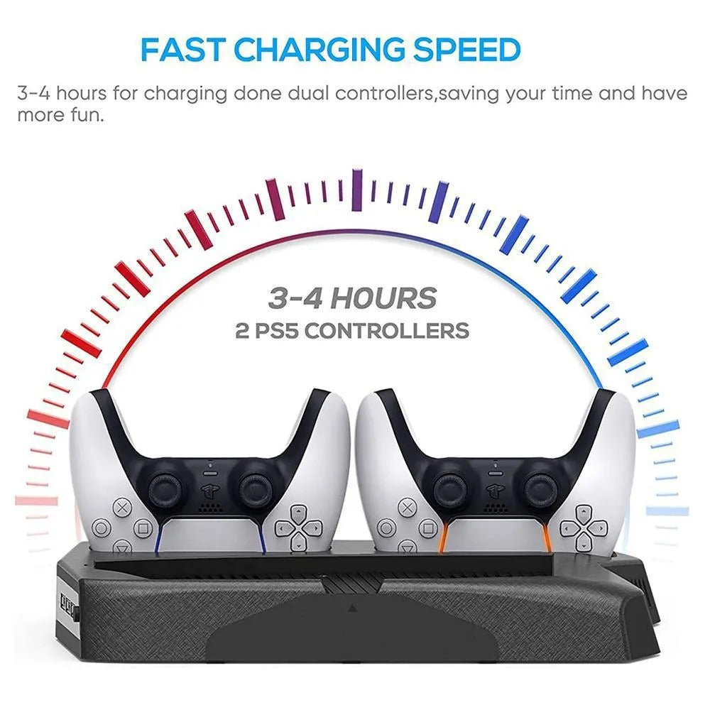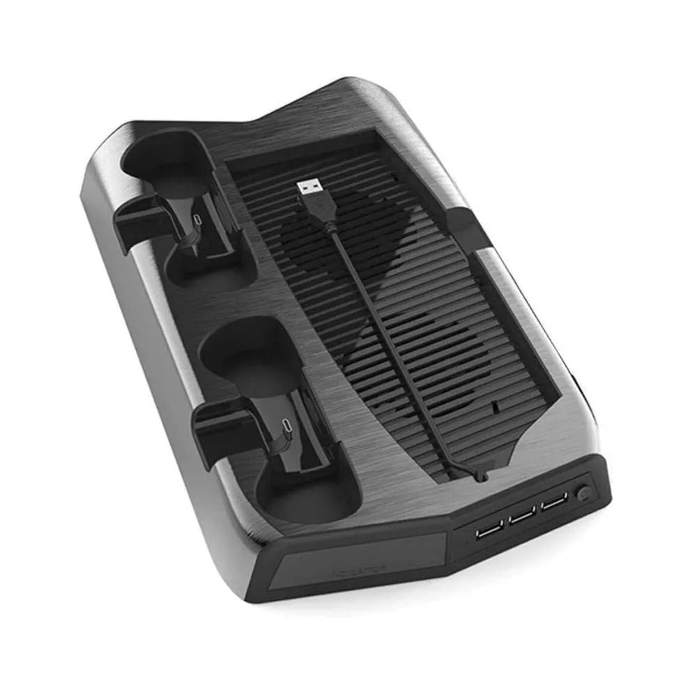 ->Estación de Carga y Refrigeración Todo en Uno para PlayStation 5Optimiza tu experiencia de juego con la estación de carga y refrigeración todo en uno diseñada específicamente para la consola PlayStation 5. Este dispositivo multifuncional no solo carga tus controladores de manera eficiente, sino que también mantiene tu consola fresca y organizada.Características Principales:Diseño Todo en Uno: La estación de carga cuenta con un soporte vertical para la PS5 que ayuda a ahorrar espacio y mantiene la zona de juego ordenada. Incorpora 3 concentradores USB para conectar otros dispositivos como ratones, teclados o auriculares, maximizando la conveniencia y el orden en tu configuración de juego.Carga Rápida y Eficiente: Puede cargar hasta 2 controladores simultáneamente, utilizando un indicador LED para mostrar claramente el estado de carga. Gracias a su diseño inteligente, el proceso de carga es rápido y eficaz. La carga a través del puerto EXT de la PS5 reduce significativamente el tiempo de carga, de 4 horas a solo 2 horas.Sistema de Refrigeración Avanzado: Equipado con 2 ventiladores de refrigeración de alta velocidad, el sistema de refrigeración integrado mantiene la consola PS5 fresca y silenciosa durante sesiones prolongadas de juego. Esta eficiente disipación de calor contribuye a prolongar la vida útil de tu consola.Compatibilidad Total: Compatible con la consola PS5 estándar y la versión Digital Edition. El puerto adicional USB HUB permite la conexión de accesorios adicionales para mejorar aún más tu experiencia de juego.Especificaciones Técnicas:Puertos USB: 3 puertos USB HUB para conectar periféricos como ratones, teclados y auriculares.Fuente de Alimentación: Se recomienda utilizar una fuente de alimentación de 5V/1.5-2A para garantizar suficiente corriente para todos los dispositivos conectados.Indicador LED: Proporciona información clara sobre el estado de carga de los controladores.Contenido del Paquete:1 x Estación de Carga y Refrigeración para PS51 x Adaptador de Corriente1 x Manual de UsuarioLa estación de carga y refrigeración todo en uno para PlayStation 5 es la solución perfecta para mantener tu consola organizada, fresca y lista para largas sesiones de juego. Aprovecha al máximo tu experiencia de juego con este dispositivo multifuncional y eficiente.