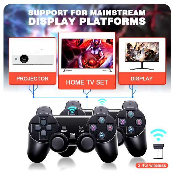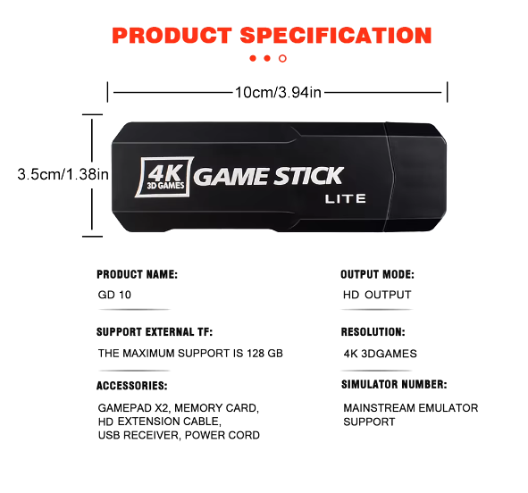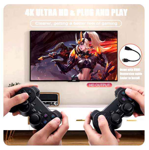 Consola de videojuegos 4K HD 40000 + juegos 2,4G controladores inalámbricos 3D Rocker TV Mini consola de juegos compatible con expansión de tarjeta TF para PS1Característica:1. Amplia compatibilidad:La consola de videojuegos es compatible con más de 50 formatos de emulador, admite más de 40.000 juegos y permite la autodescarga de juegos.2. Diseño mecánico:El diseño mecánico de la mini consola de juegos de TV es genial, futurista y de moda, lo que la convierte en un atractivo accesorio para jugar.3. Joystick 3D:La consola Arcade está equipada con un joystick antideslizante de alta sensibilidad, diseñado específicamente para juegos de arcade, que proporciona una experiencia de juego fluida y precisa.4. Sistema de código abierto Linux Retroarchi: La consola de juegos retro funciona con un sistema Linux Retroarchi de código abierto, lo que permite una interfaz fácil de usar y una fácil personalización.5. Soporte multilingüe: Los controladores inalámbricos son compatibles con varios idiomas, lo que los hace accesibles a usuarios de todo el mundo.Especificación:Certificación: NINGUNAOrigen: China continentalPaquete: SíPeso: 390GCategoría: Consola de videojuegosNúmero de modelo: consola de videojuegosCPU: Aigame 905XMemoria: DDR3 2GBSistema: Emuelec4.3Tamaño: 100*35*11mm/3,9*1,3*0.4inColor: NegroAdmite expansión de tarjeta TF, hasta 256GB (SD2. X, SD3. X, SD4. X, eMMC versión 5,0)Permite a los usuarios descargar juegos en formatos relacionadosJuegos: 30000 +/40000 + juegos integrados con tarjeta de 64GB/128GBTipo: 64G/128G (opcional)Función: con función de búsqueda, función de favoritos y función de guardado del progreso del juegoLa Salida de alta definición admite 4K de alta definición: Salida 60FPS Max, salida 2.1D de alta definición resolución 1280*720Idioma: admite varios idiomas (23 idiomas, incluido el chino simplificado, el chino tradicional, el inglés, el japonés y el coreano) para el funcionamiento del sistemaControlador inalámbrico: el controlador inalámbrico de 2,4G admite 1-2 jugadores, sin limitaciones de cable y permite la reproducción gratuitaAdmite más de 50 emuladores: CP1, CP2, CP3, Neogeo, GBX, MAME, FC, FCE, SFC, GB, GBA, GBC, MD, PS1, PSP, DC, PD: más de 50 simuladores como el FC.FCE, SFC, GB.GBA.GBC.MDNGPC, MEGADRIVE, GAMEGEAR, SEGAGENESIS, SG-1000, etc.Nota:Debido a los diferentes monitores y efectos de luz, el color real del artículo puede ser ligeramente diferente del color que se muestra en las imágenes. ¡Gracias!Permita una desviación de medición de 1-2cm debido a la medición manual. 1 x Palo para juegos 4KMango de controlador inalámbrico de 2x2,4G1 receptor inalámbrico USB1 x Cable HD1 x tarjeta TF1 x cable de alimentación USB1 manual de usuario